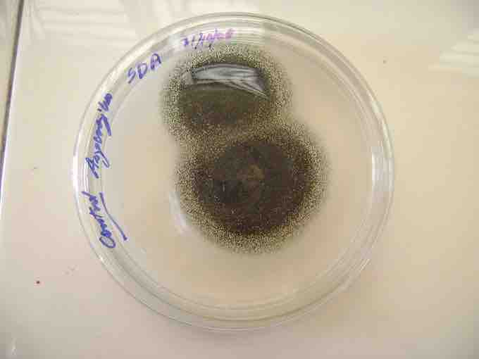 The black dots covering the colonies are Aspergillus spores. The growth medium is Saboraud's Dextrose Agar (SDA)