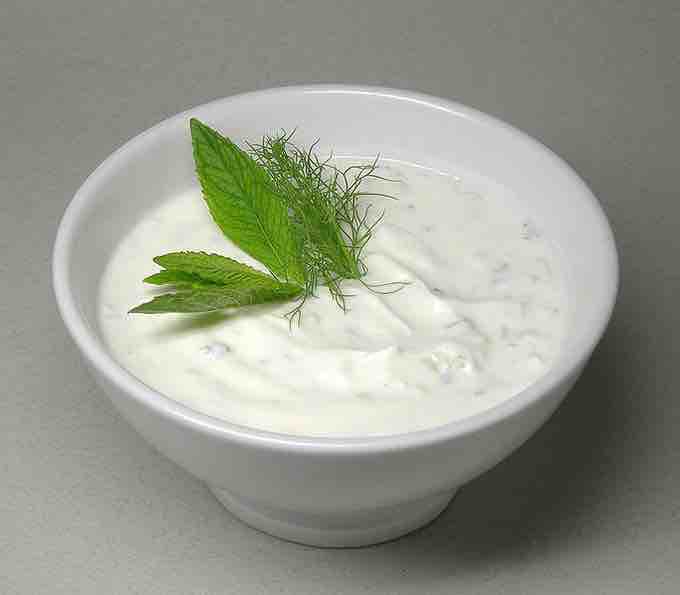 A yogurt dish made of plain yogurt and cucumbers.