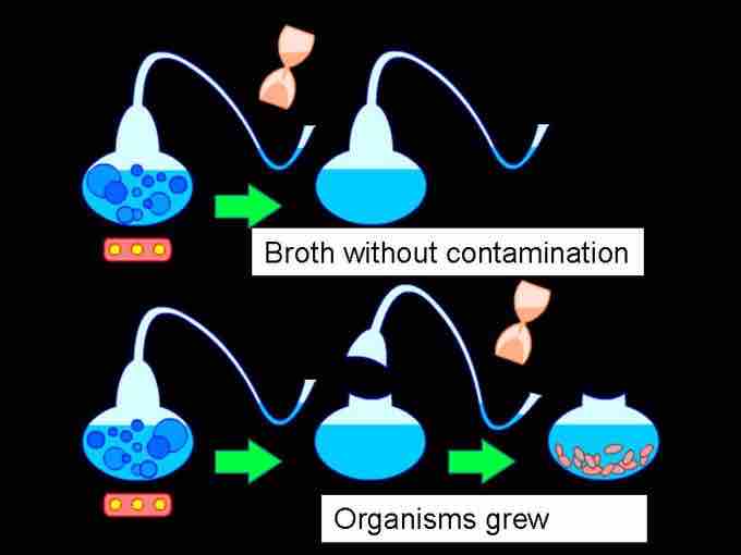 By sterilizing a food source and keeping it isolated from the outside, Pasteur observed no putrefaction of the food source (top panel). Upon exposure to the outside environment, Pasteur observed the putrefaction of the food source (bottom panel). This strongly suggested that the components needed to create life do not spontaneously arise.