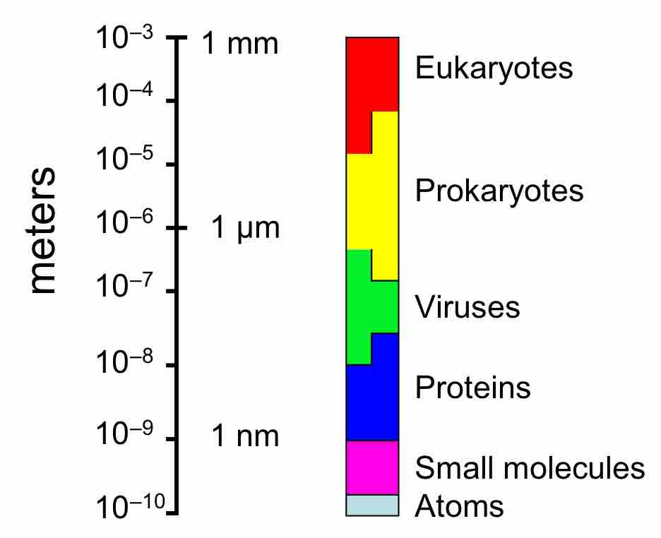 Relative scales of eukaryotes, prokaryotes, viruses, proteins and atoms (logarithmic scale).