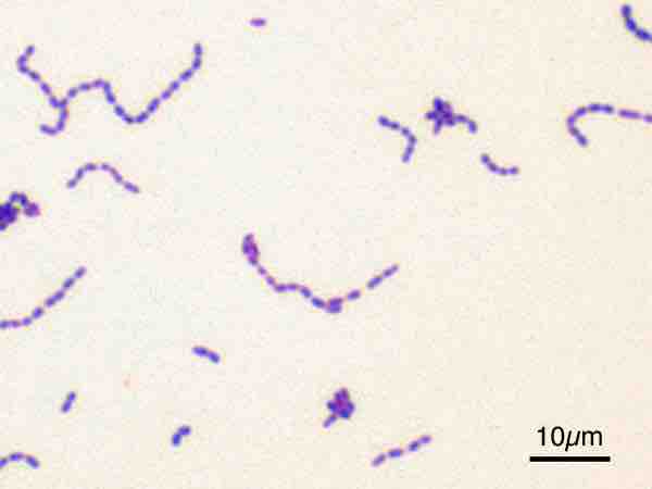 Streptococcus mutans visualized with a Gram stain.