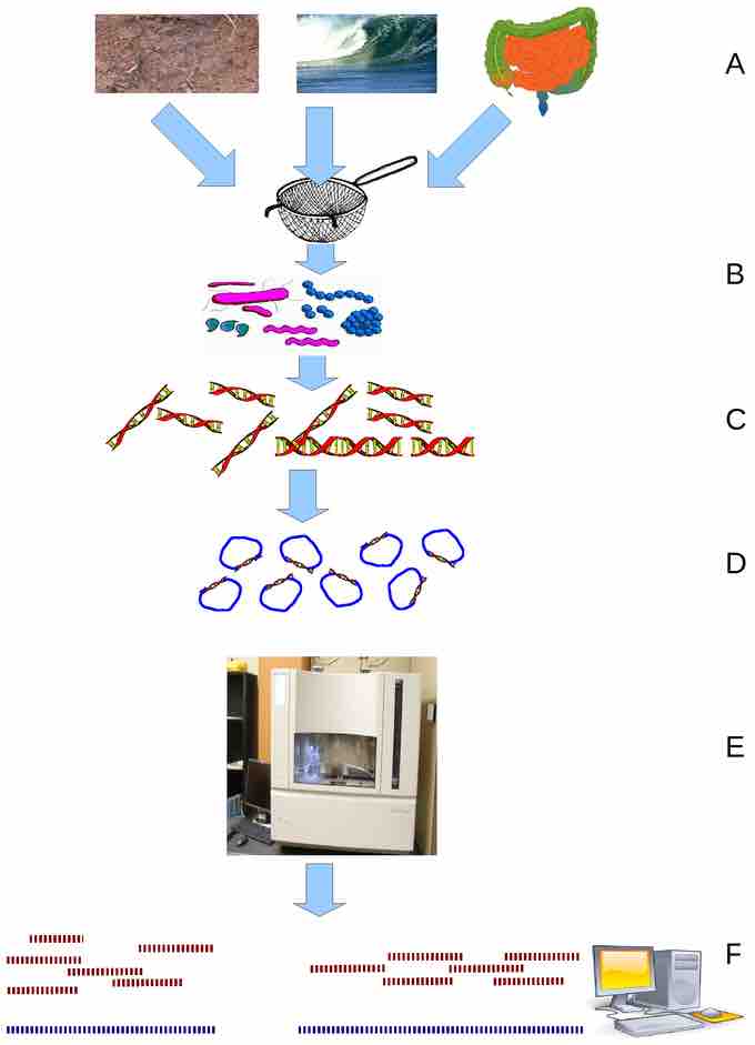 (A) sampling from habitat; (B) filtering particles, typically by size; (C) Lysis and DNA extraction; (D) cloning and library construction; (E) sequencing the clones; (F) sequence assembly into contigs and scaffolds