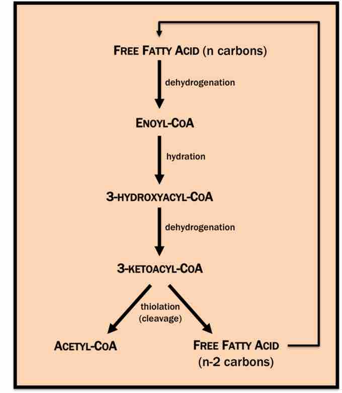 1. Fatty acid chains are converted to enoyl-CoA (catalyzed by acyl-CoA dehydrogenase).