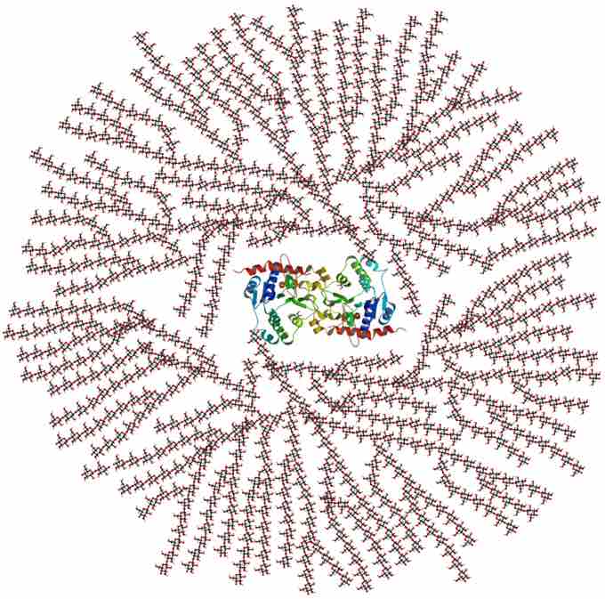 Schematic two-dimensional cross-sectional view of glycogen: A core protein of glycogenin is surrounded by branches of glucose units. The entire globular granule may contain around 30,000 glucose units.