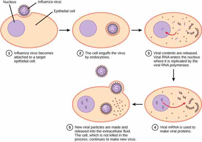 In influenza virus infection, glycoproteins attach to a host epithelial cell. As a result, the virus is engulfed. RNA and proteins are made and assembled into new virions.