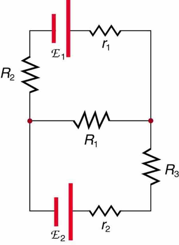 Kirchhoff's laws are extremely important to the analysis of closed circuits. Consider, for example, the circuit illustrated in the figure below, consisting of five resistors in a combination of in series and parallel arrangements. Simplification of this circuit to a combination of series and parallel connections is impossible. However, using Kirchhoff's rules, one can analyze the circuit to determine the parameters of this circuit using the values of the resistors (R1, R2, R3, r1 and r2). Also of importance in this example is that the values E1 and E2 represent sources of voltage (e.g., batteries).