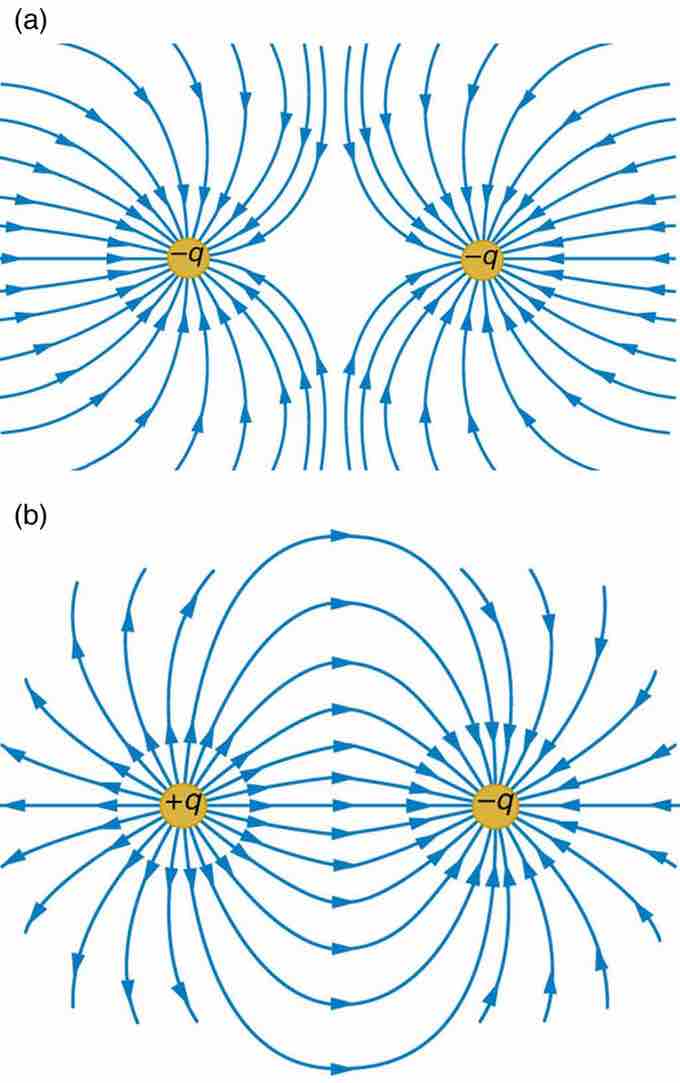 Example a shows how the electric field is weak between like charges (the concentration of field lines is low between them). Example b, by contrast, has a strong field between the charges, as exhibited by the high concentration of field lines connecting them.