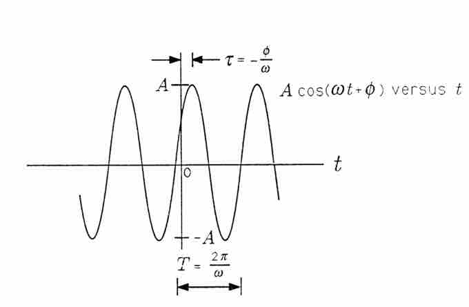 illustrated in the figure below is a cosinusoidal signal with amplitude A, frequency, and phase θ. The amplitude A characterizes the peak-to-peak swing of 2A, the angular frequency ω characterizes the period T=2π/ω between negative- to-positive zero crossings (or positive peaks or negative peaks), and the phase θ characterizes the time τ=−θ/ω when the signal reaches its first peak. With so defined, the signal x(t) may also be written as