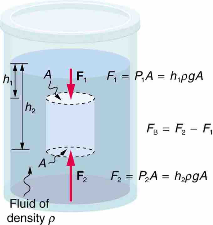 The fluid pushes on all sides of a submerged object. However, because pressure increases with depth, the upward push on the bottom surface (F2) is greater than the downward push on the top surface (F1). Therefore, the net buoyant force is always upwards.