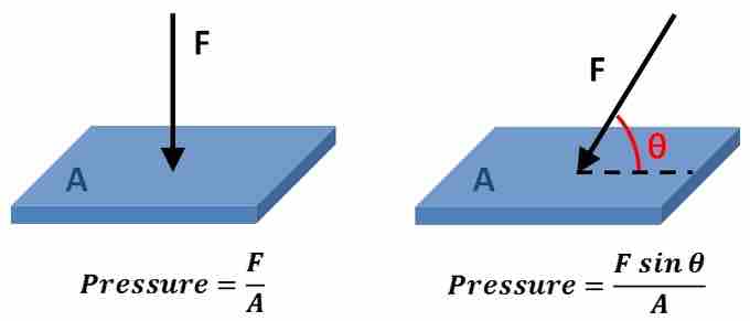where p is pressure, F is the force acting perpendicular to the surface to which this force is applied, and A is the area of the surface. Any object that possesses weight, whether at rest or not, exerts a pressure upon the surface with which it is in contact. The magnitude of the pressure exerted by an object on a given surface is equal to its weight acting in the direction perpendicular to that surface, divided by the total surface area of contact between the object and the surface. shows the graphical representations and corresponding mathematical expressions for the case in which a force acts perpendicular to the surface of contact, as well as the case in which a force acts at angle θ relative to the surface.