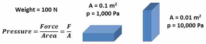 Since pressure depends only on the force acting perpendicular to the surface upon which it is applied, only the force component perpendicular to the surface contributes to the pressure exerted by that force on that surface. Pressure can be increased by either increasing the force or by decreasing the area or can oppositely be decreased by either decreasing the force or increasing the area. illustrates this concept. A rectangular block weighing 1000 N is first placed horizontally. It has an area of contact (with the surface upon which it is resting) of 0.1 m2, thus exerting a pressure of 1,000 Pa on that surface. That same block in a different configuration (also in Figure 2), in which the block is placed vertically, has an area of contact with the surface upon which it is resting of 0.01 m2, thus exerting a pressure of 10,000 Pa—10 times larger than the first configuration due to a decrease in the surface area by a factor of 10.