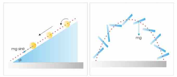 Significantly, the center of a ball (the COM of a rolling ball) follows a straight linear path; whereas the COM of a stick follows a parabolic path (as shown in the figure above). Secondly, the forces appear to operate on the COMs in two cases ("mgsinθ and "mg") as if they were indeed particle-like objects. This concept of COM, therefore, eliminate the complexities otherwise present in attempting to describe motions of rigid bodies.