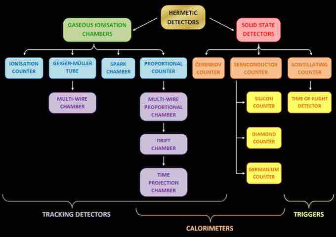 A radiation detector is a device used to detect, track, or identify high-energy particles, such as those produced by nuclear decay, cosmic radiation, and reactions in a particle accelerator. Modern detectors are also used as calorimeters to measure the energy of detected radiation. They may be also used to measure other attributes, such as momentum, spin, and charge of the particles. Different types of radiation detectors exist ; gaseous ionization detectors, semiconductor detectors, and scintillation detectors are the most common.