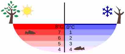 Perhaps the most striking effect of this phenomenon is the freezing of water in a pond. When water near the surface cools down to 4ºC it is denser than the remaining water and thus will sink to the bottom. This "turnover" results in a layer of warmer water near the surface, which is then cooled. Eventually the pond has a uniform temperature of 4ºC. If the temperature in the surface layer drops below 4ºC, the water is less dense than the water below, and thus stays near the top.