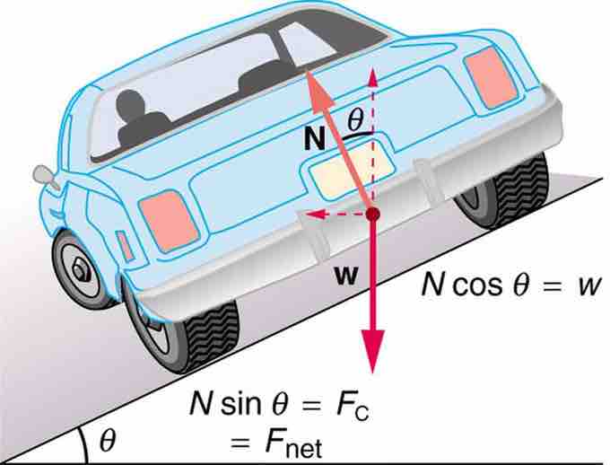 • For ideal banking, the components of the normal force $N$ in the horizontal and vertical directions must equal the centripetal force and the weight of the car, respectively.