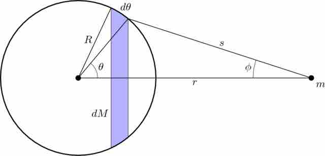 This diagram outlines the geometry considered when proving The Shell Theorem. In particular, in this case a spherical shell of mass $M$ (left side of figure) exerts a force on mass $m$ (right side of the figure) outside of it. The surface area of a thin slice of the sphere is shown in color. (Note: The proof of the theorem is not presented here. Interested readers can explore further using the sources listed at the bottom of this article.)