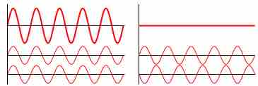 Examples of constructive (left) and destructive (right) wave interference.