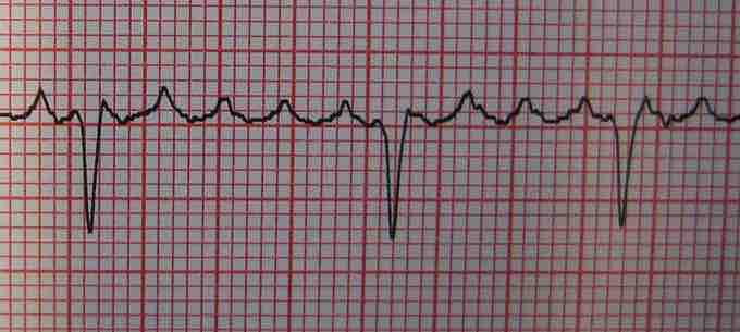 Schematic diagram of normal sinus rhythm for a human heart as seen on ECG. In atrial fibrillation, one form of cardiac arrhythmia, the P waves, which represent depolarization of the atria, are absent.