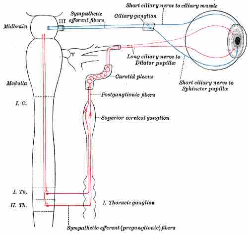 The sympathetic connections of the ciliary and superior cervical ganglia are shown in this digram. The postganglionic fibers travel from the ganglion to the effector organ.
