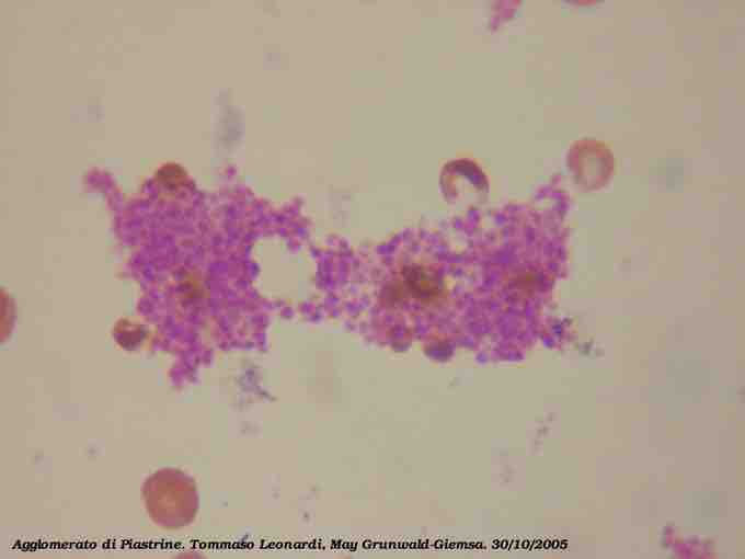 A blood slide of platelets aggregating, or, clumping together. The platelets are the small, bright purple fragments.