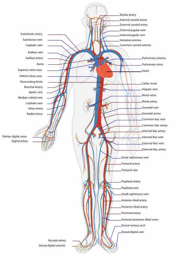 This simplified diagram of the human circulatory system (anterior view) shows arteries in red and veins in blue.