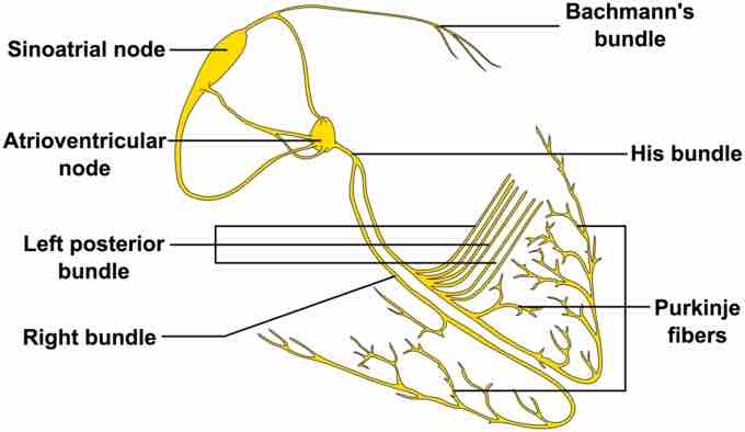 The AV node is a bundle of conducting tissue (not formally classified as nerve tissue) located at the junction between the atria and ventricles of the heart. The AV node receives action potentials from the SA node, and transmits them through the bundle of His, left and right bundle branches, and Purkinje fibers, which cause depolarization of ventricular muscle cells leading to ventricular contraction. The AV node slightly slows the neural impulse from the SA node, which causes a delay between depolarization of the atria and the ventricles.