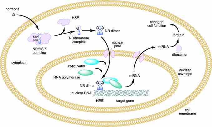This figure depicts the mechanism of a class I nuclear receptor (NR) that, in the absence of ligand, is located in the cytosol. Hormone binding to the NR triggers translocation to the nucleus, where the NR binds to a specific sequence of DNA known as a hormone response element (HRE).