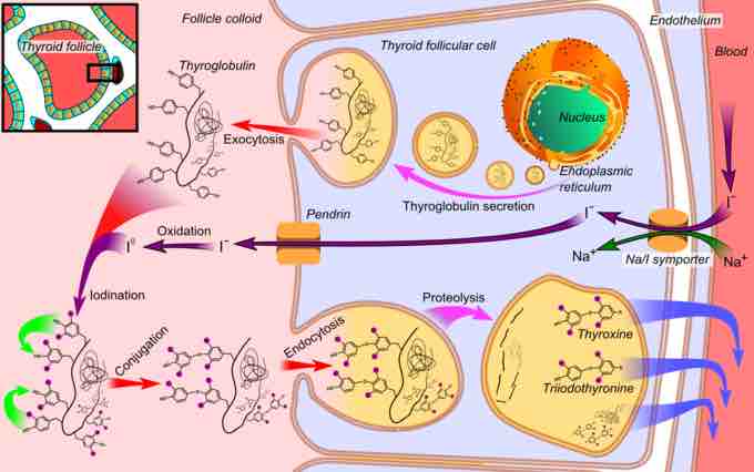 Thyroglobulin, the pre-cursor of T4 and T3, is produced by the thyroid follicular cells before being secreted and stored in the follicular lumen. Iodide is actively absorbed from the bloodstream by a process called iodide trapping. In this process, sodium is co-transported with iodide from the basolateral side of the membrane into the cell, and then concentrated in the thyroid follicles to about thirty times its concentration in the blood.