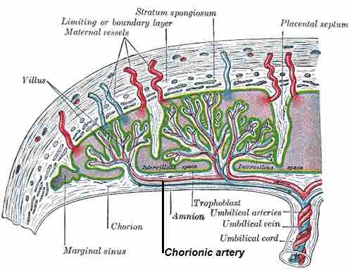 Image illustrating the placenta and chorionic villi. The umbilical cord is seen connected to the fetus and the placenta.