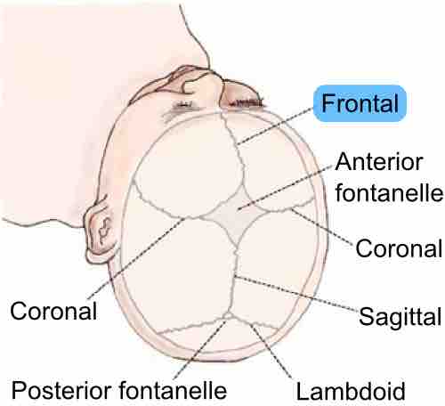 Drawing of human baby skull seen from the top. Cranial sutures are depicted with the frontal suture highlighted in blue.