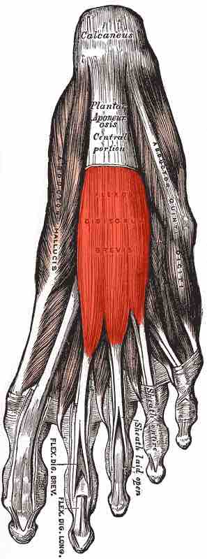 Flexor Digitorum Brevis - The flexor digitorum brevis muscle is located laterally to the abductor hallucis and lies in the middle of the sole of the foot.