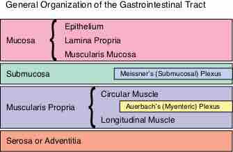 This is a chart showing the general organization of the gastrointestinial tract. The chart illustrates mucosa in the body in relation to other lining components as four boxes. The bottom box on the chart is labeled Serosa or Adventitia. The box above it is labeled Muscularis Propia and this is related to circular muscle, Auerbach's (Myenteric) Plexus, and longtitudinal muscle. The their box above is labeled Submucosa and is related to Meissner's (Submucosal) Plexus. The top box is labeled Mucosa and relates to the epithelium, lamina propria, and muscularis mucosa.