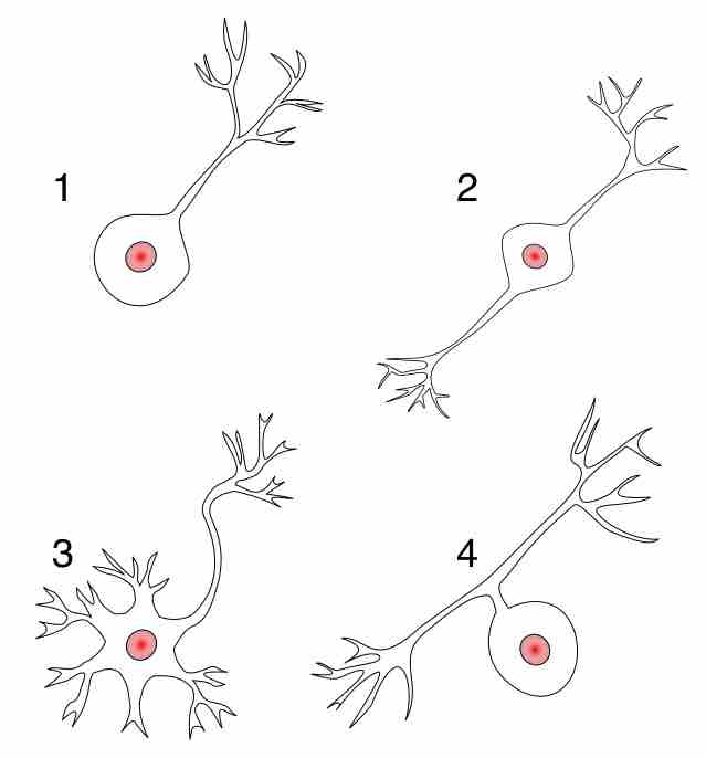 1: Unipolar neuron, 2: Bipolar neuron, 3: Multipolar neuron, 4: Pseudounipolar neuron