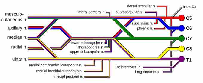 Diagram of the brachial plexus and its branches.