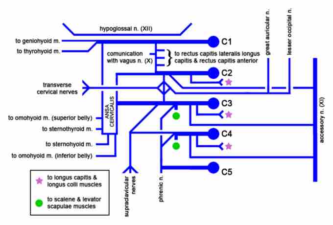 The cervical plexus is a plexus of the ventral rami of the first four cervical spinal nerves located from the C1 to C4 cervical segment in the neck. They are located laterally to the transverse processes between prevertebral muscles from the medial side and anteriolateral to the m. scalenus and m. levator scapulae.