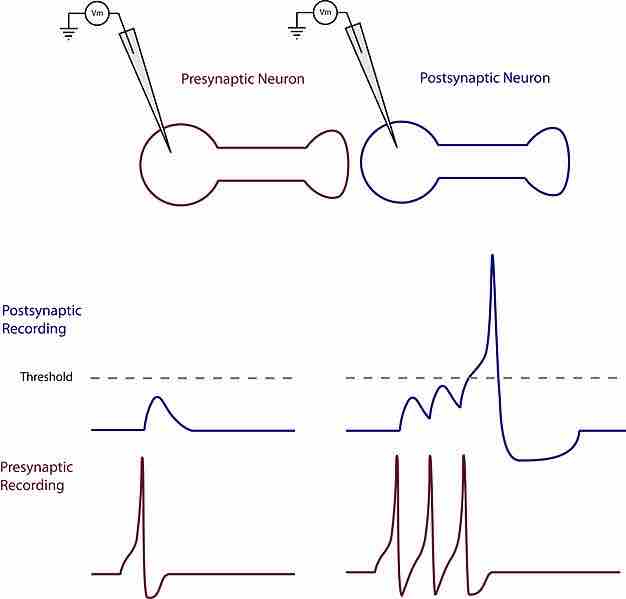 Temporal summation, shown in the diagram, is the transmitting of signals with increased frequency of impulse, thus increasing the strength of signals in each fiber. Temporal summation is a potent mechanism for generation of referred muscle pain. The diagram shows a neuron receiving a pain stimulus. The stimulus causes a spike in the presynatpic neuron diagram, and this spike gets amplified in the postsynaptic neuron diagram, making its signal cross over the threshold of consciousness to register pain.