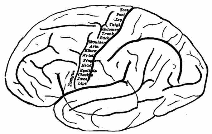 Topography of the primary motor cortex, on an outline drawing of the human brain. Each part of the primary motor cortex controls a different part of the body.