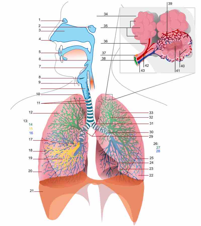 This figure details the respiratory system including the bronchi and its many subdivisions.