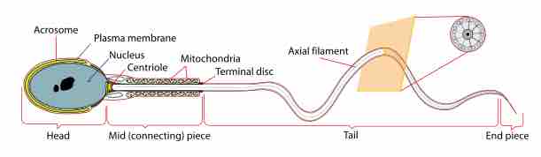 Diagram of parts of a spermatozoon, including the acrosome, plasma membrane, nucleus, centriole, mitochondria, terminal disc, axial filament, tail, endpiece, midpiece, and head.