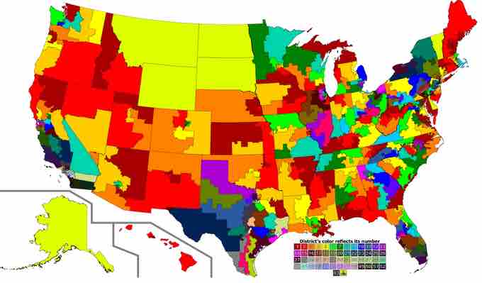 Districts are generally reevaluated after each 10 year census. The districts are redrawn as needed to adjust to population changes. However, this is not a completely neutral process. The practice of gerrymandering has been used to insure that one or the other party will have an easier time winning elections by creating districts that hold a majority of voters likely to vote for one party or the other. Looking at the maps of congressional districts it is obvious that some districts are far from uniform. The more complicated shapes on the map might be a result of gerrymandering.