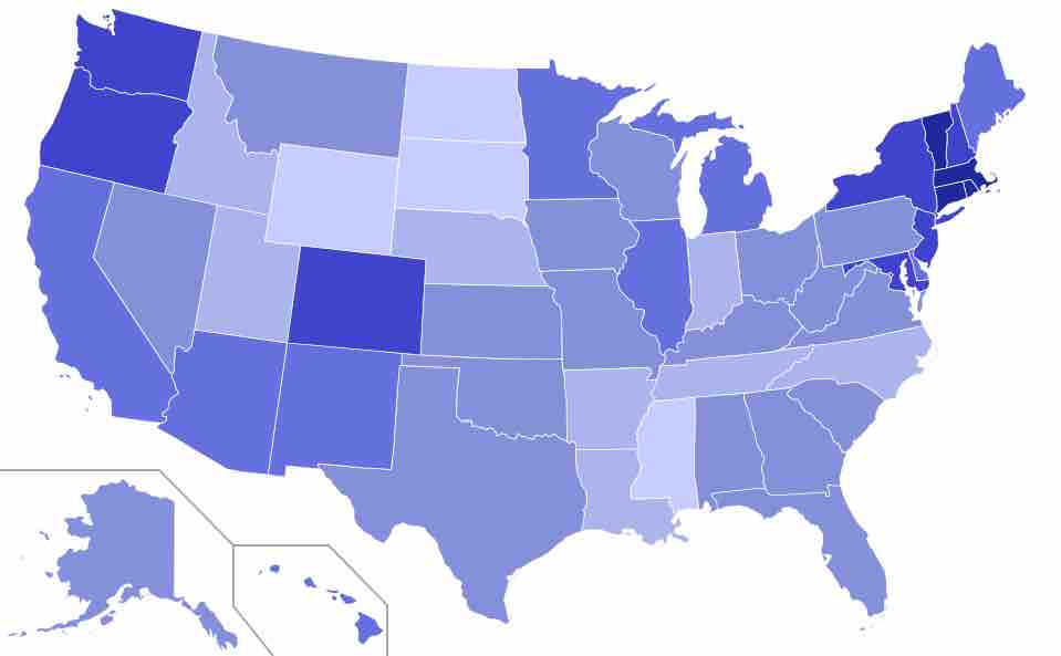 Percent of self-identified liberals in the United States, broken down by state, according to Gallup, August 2010. The darkest colors to lightest colors, respectively, indicate the greatest percentages of people identifying as liberals. (The darkest color represents 28% and above, while the lightest color is under 14%).