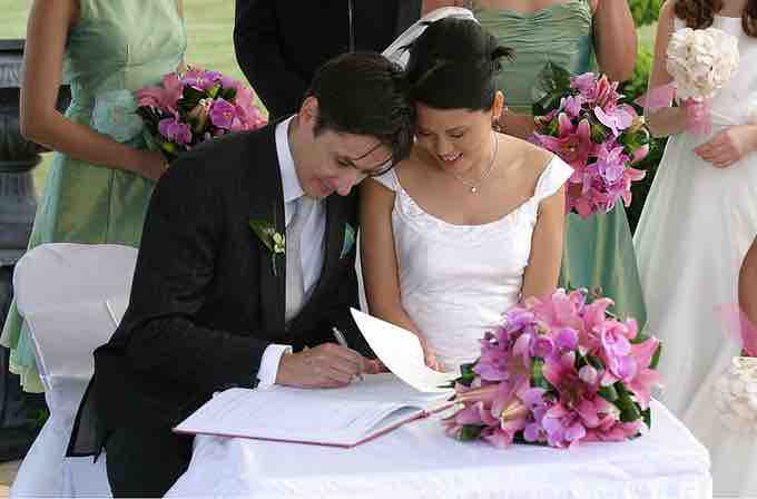 Bride and groom signing the book