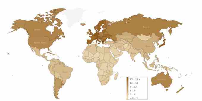 This map illustrates global trends in aging by depicting the percentage of each country's population that is over the age of 65. More developed countries have older populations because their citizens live longer. Less developed countries have much younger populations.