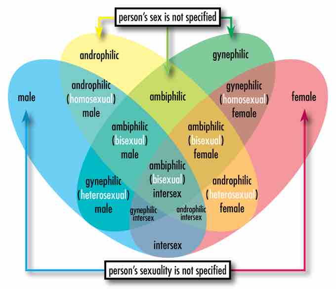 Venn diagram depicting the relationships between assigned sex and sexual orientation. Androphilia and gynephilia are preferred terms for some populations, because homosexual and heterosexual assign a sex to the person being described.
