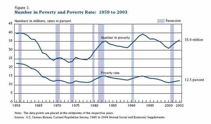 This chart depicts the number of people living in poverty during each year from 1959-2003. The poverty rate corresponds to what proportion of Americans live in the lowest economic strata of the hierarchical class system.