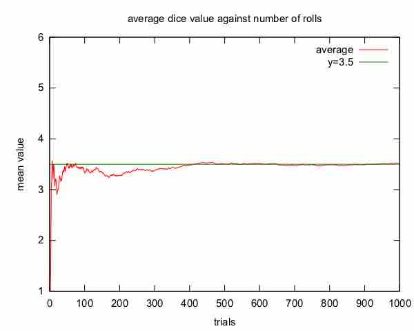 An illustration of the law of large numbers using a particular run of rolls of a single die. As the number of rolls in this run increases, the average of the values of all the results approaches 3.5. While different runs would show a different shape over a small number of throws (at the left), over a large number of rolls (to the right) they would be extremely similar.