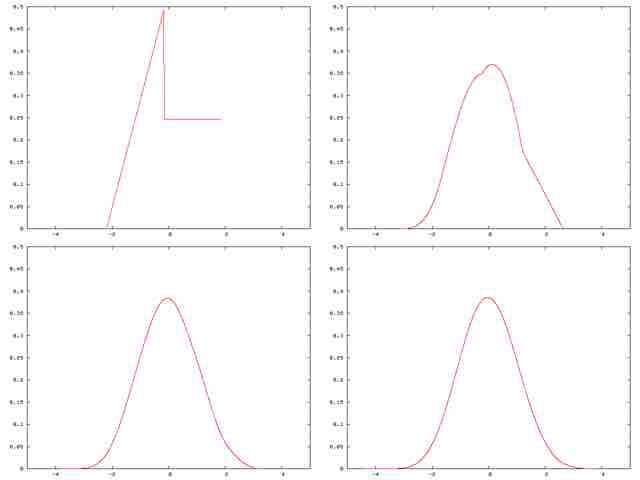 A distribution being "smoothed out" by summation, showing original density of distribution and three subsequent summations
