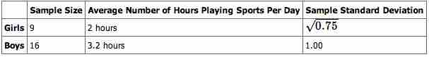 The average amount of time boys and girls ages 7 through 11 spend playing sports each day is believed to be the same. An experiment is done, data is collected, resulting in the table below. Both populations have a normal distribution.