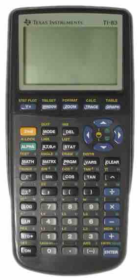 The TI-83 series of graphing calculators, shown in , is manufactured by Texas Instruments. Released in 1996, it was one of the most popular graphing calculators for students. In addition to the functions present on normal scientific calculators, the TI-83 includes many andvanced features, including function graphing, polar/parametric/sequence graphing modes, statistics, trigonometric, and algebraic functions, along with many useful applications.