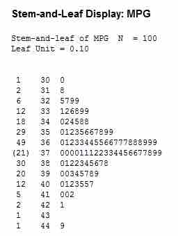 This is an example of a stem-and-leaf display for EPA data on miles per gallon of gasoline.